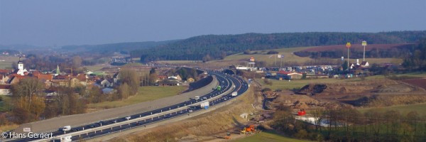 Auf dem Foto sieht man links der Autobahn den Altort Geiselwind mit der katholischen Pfarrkirche St. Burkard. Rechts der Autohof Strohofer mit der Autobahnkirche.